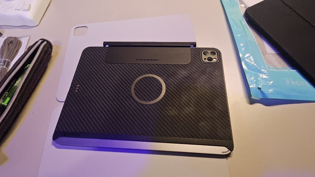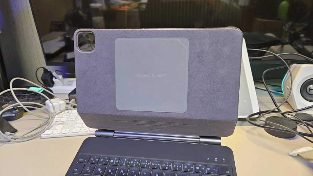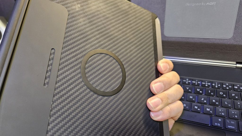 ipad を縦置きしたかったのでPITAKAのケースに磁石が付いているみたいでしたが、マジックキーボード側の磁石の位置などipadを縦に置くとズレて固定できないためMOFT マグネットシールをマジックキーボード側に張った。
